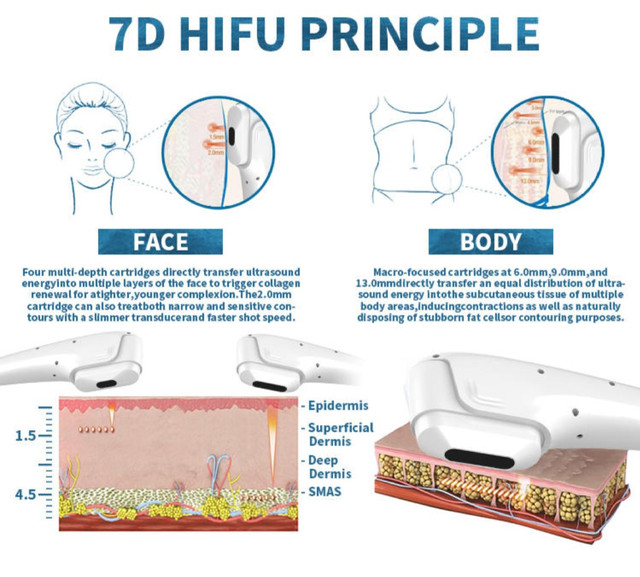 Аппарат использует инновационную технологию 7 D HIFU- эта технология использует принцип ультразвуковой фокусировки высокой интенсивности для проникновения звуковых волн с целью термического прогрева тканей. HIFU — HIGH FRIQUENTLT ULTRASOUND – высокочастотный ультразвук который при взаимодействии с биологическими тканями способен вызывать краткосрочный прогрев подкожного слоя до 65-75 градусов по Цельсию. Во время процедуры аппарат точно контролирует энергию каждой точки абляции и сосредотачивается на необходимом слое кожи. В результате такого термовоздействия формируются небольшие очаги коагуляции, достигающие четко заданной специалистом глубины. Усовершенствованная технология позволяет за одну процедуру проводить воздействие на 7 уровнях. Это позволяет добиться значительных результатов при работе с дряблость кожи, глубокими возрастными изменениями, жировыми отложениями и другими косметологическим дефектами связанными с провисаниями кожи и жировыми отложениями. Важно, верхние слои, такие как эпидермис, не травмируются, то есть процедура всесезонная и не провоцирует пигментаций. Принцип работы HIFU – терапии основан на нанесении микротравм внутри , так называемых точек абляции внутри биологичекских тканей, в результате чего происходит сокращение коллагеновых волокон в SMAS, при этом ускоряя процесс выработки новых коллагеновых организм начинает активною регенерацию в тканях. В ПЖК точки абляциии способствуют уменьшению объемов ткани а также выравнивают структуру и поверхность ткани