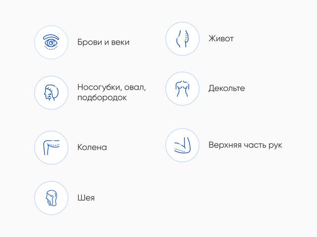 | Зоны обработки | лицо, периорбитальная зона, шея, губы, руки, тело |