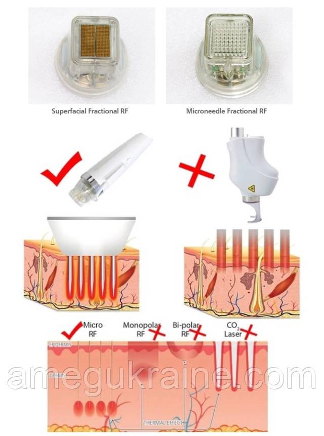 — глубина воздействия контролируется механическим выдвижением игл на заданную глубину: от 0,2 до 3,5 мм дополнительная зона прогрева + 1 мм